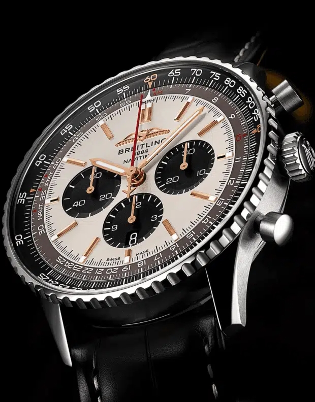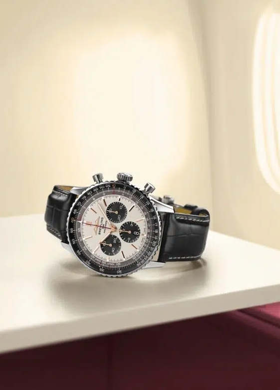 The strap complements this refined design. The Navitimer offers several options, including an elegant and durable leather strap, perfect for everyday use. This strap harmoniously matches the case for a chic look, both sporty and refined.