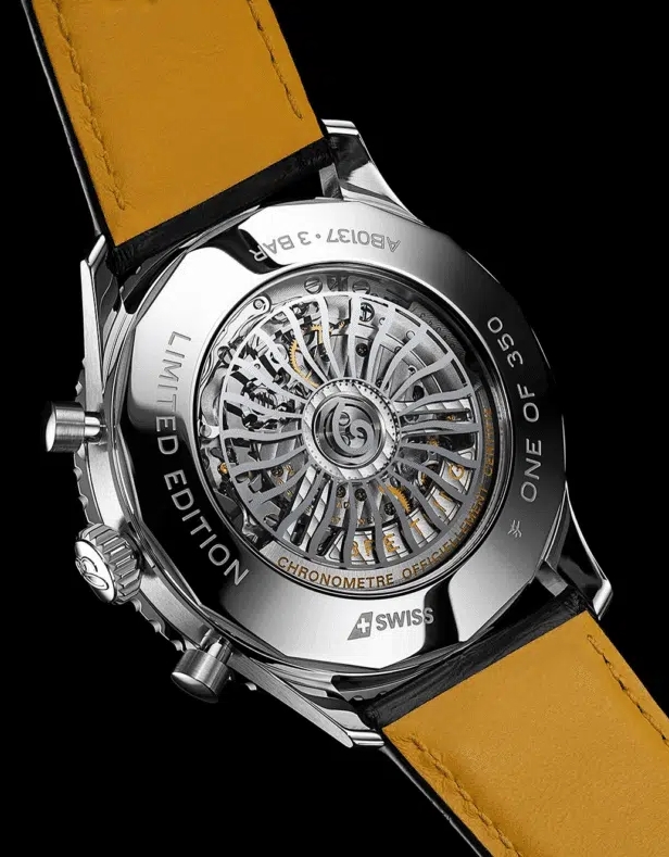 One of the most fascinating aspects of this movement is its transparent sapphire case back, allowing you to admire the craftsmanship of the caliber 01. An exclusive engraving, depicting the turbine of the Airbus A350 engine, is also present, reinforcing the aviation aspect of this limited edition. This movement is not only a technical achievement; it reflects unparalleled craftsmanship, the result of several decades of watchmaking expertise.